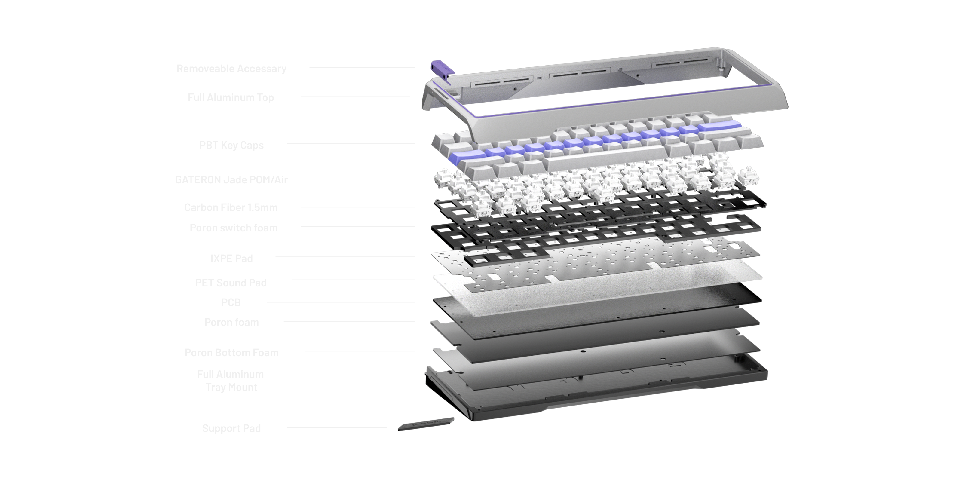 5-layer stack: Poron foam + IXPE pad + PET sound pad; plus Poron switch foam & Poron bottom foam